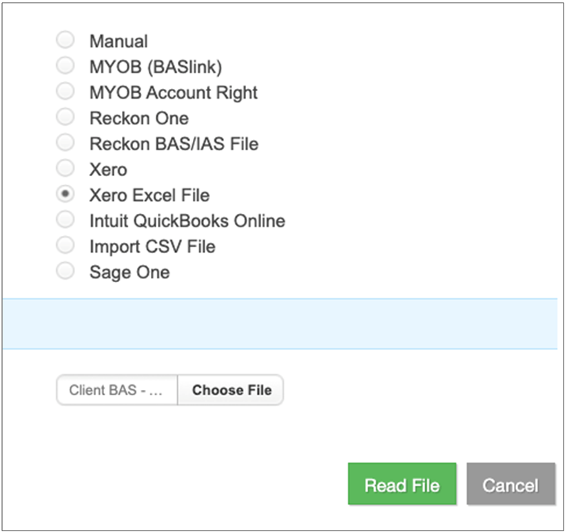 From Choose File, select the saved Xero BAS Excel file, then select Read File.