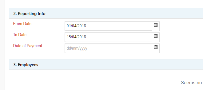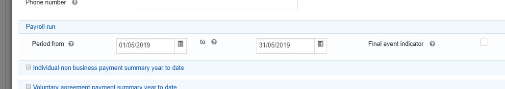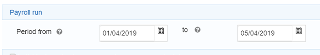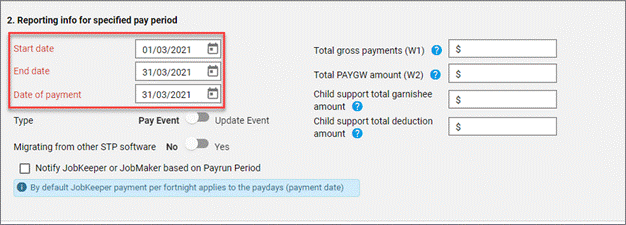 In Reporting info for specified pay period, enter pay run start date, end date and date of payment.