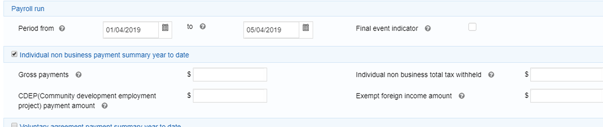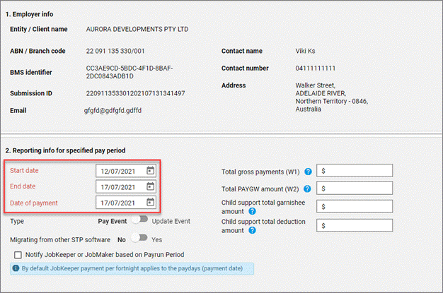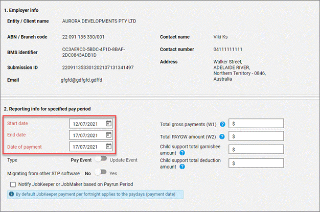 The period start and end dates have been populated from the STP Payroll Event information. Check these are correct or edit.