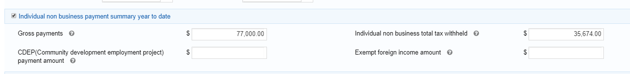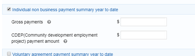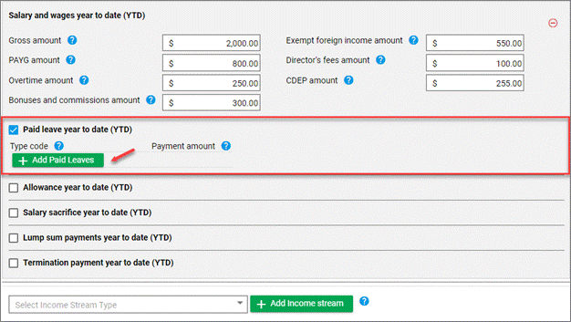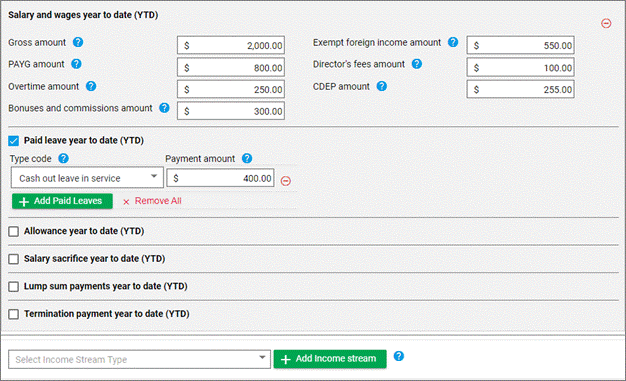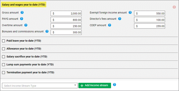 If there is more than one type of income stream, another income stream can be selected and year to date figures entered for all required payroll categories for the second income stream.