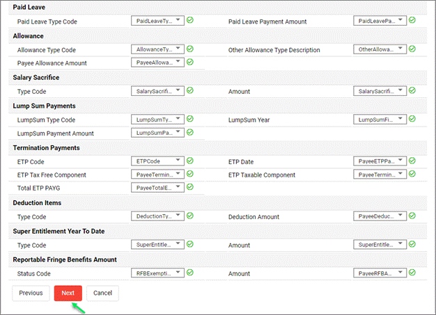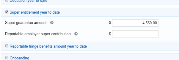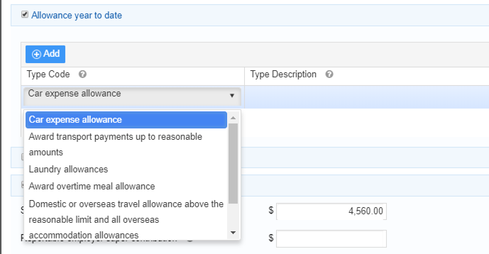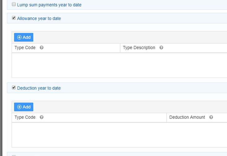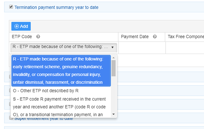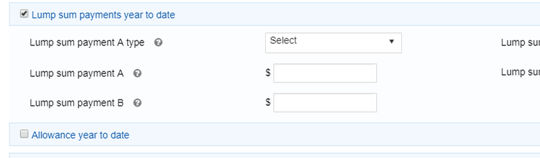 To record paid leave, allowances, salary sacrifice, lump sum payments or termination payments, tick the checkbox for each required section and select the Add option.