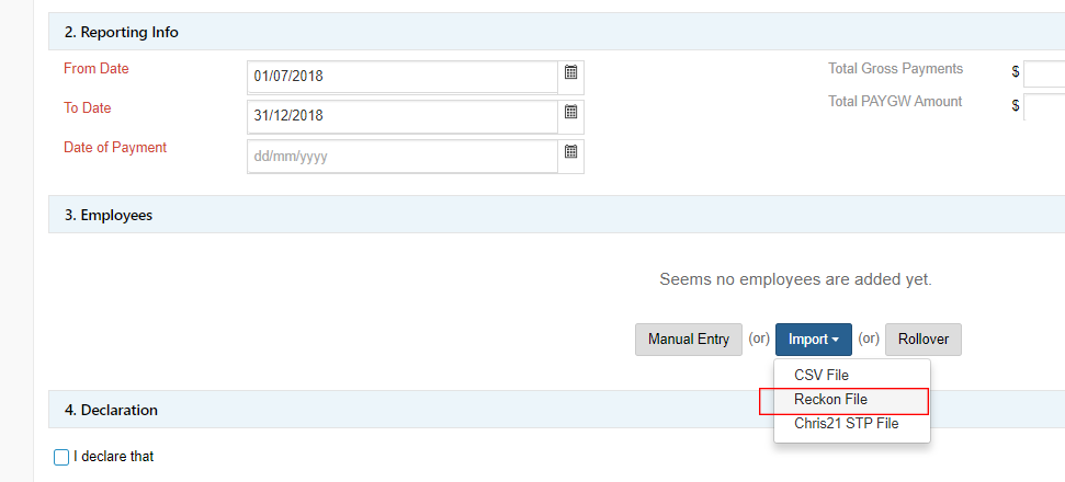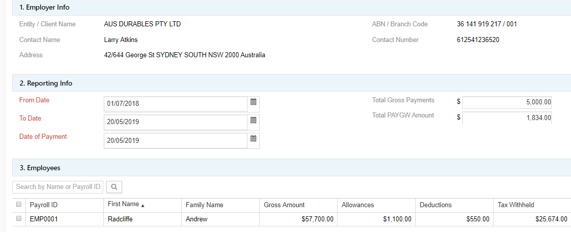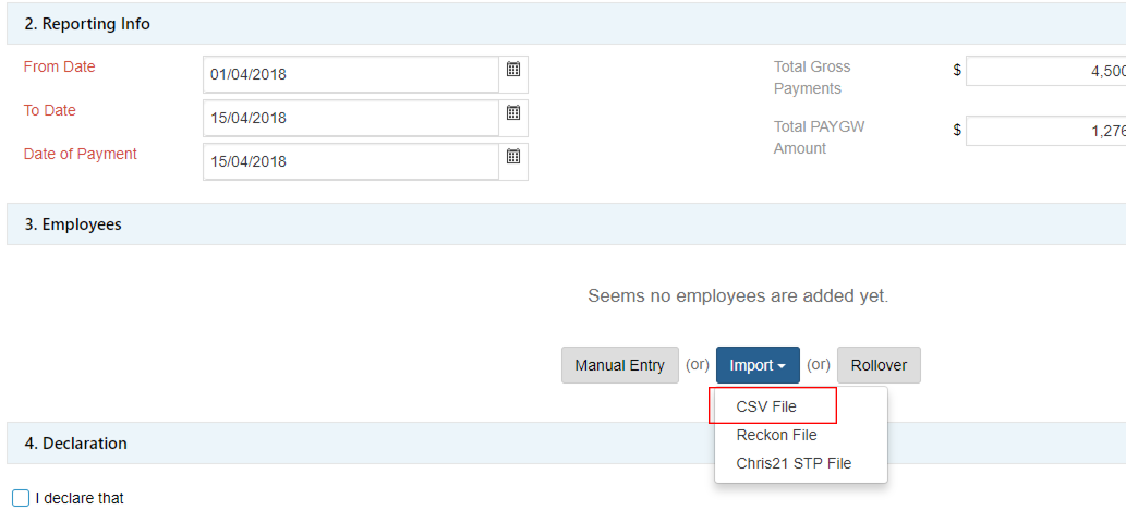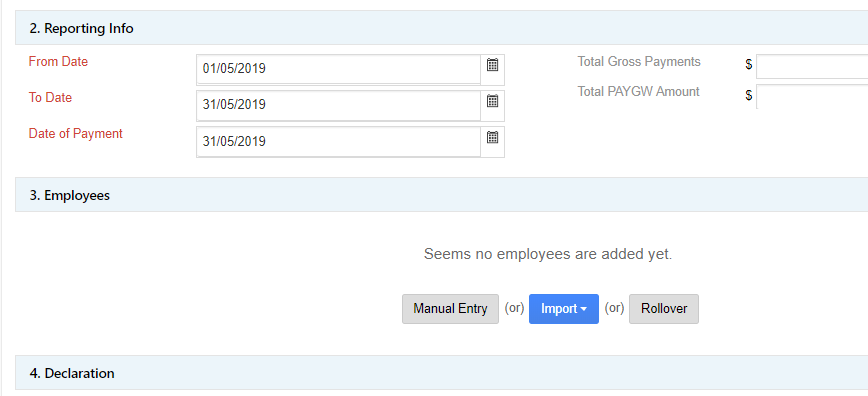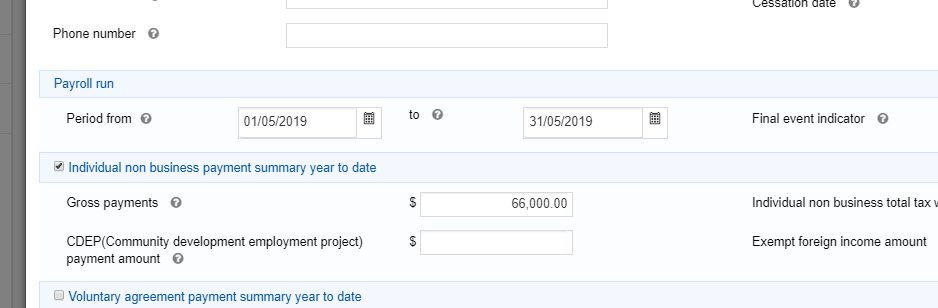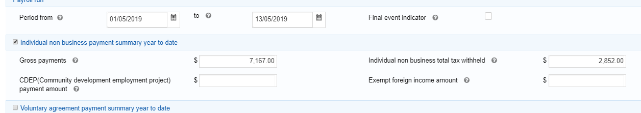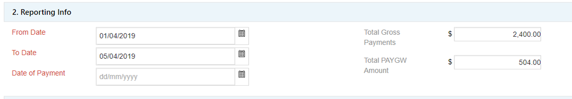 Return to the Reporting info for specified pay period section. Enter the gross payments, PAYGW and superannuation amounts.