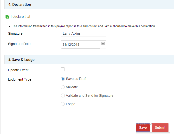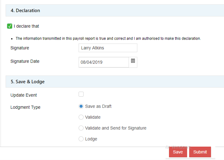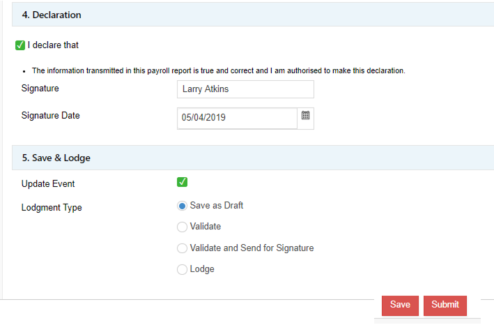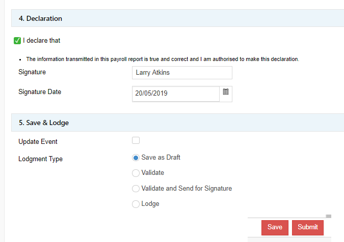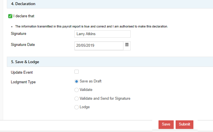 There are several options for saving and lodging reports, including linking a report to a digital signature request for authorisation from the employer.