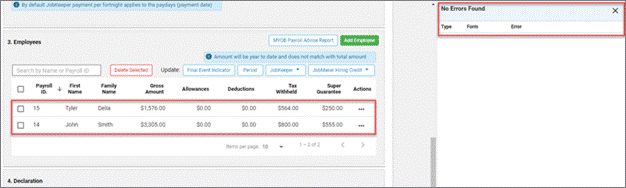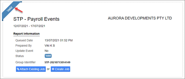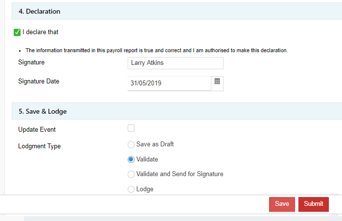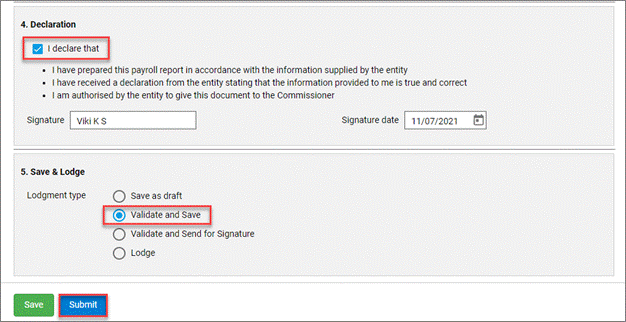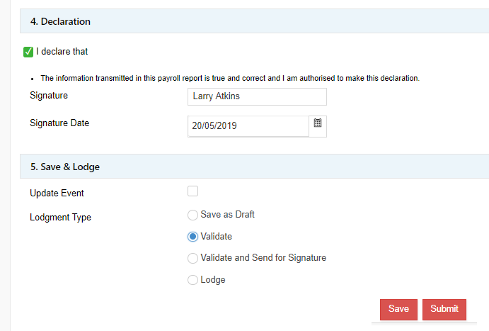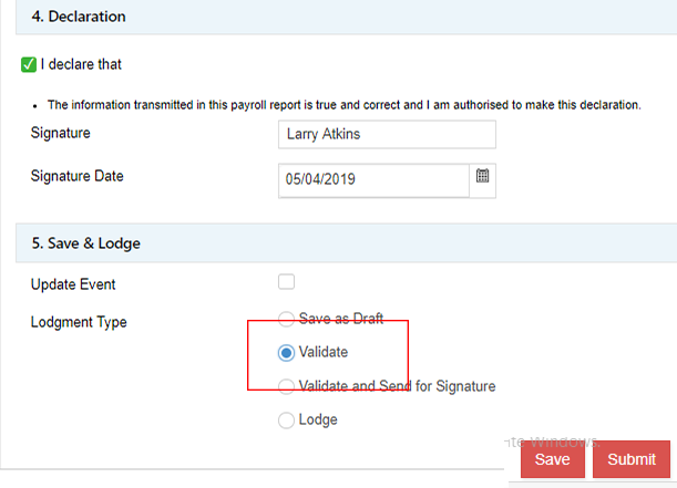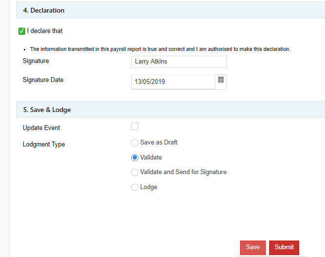 Validate and Save validates the STP report with the ATO for verification. This option checks for any lodgment errors prior to submitting to the ATO. If there are no errors, the STP report will be saved as Valid status under My Lodgments > Saved Reports.
