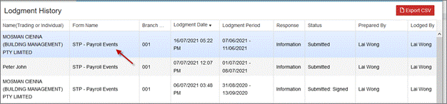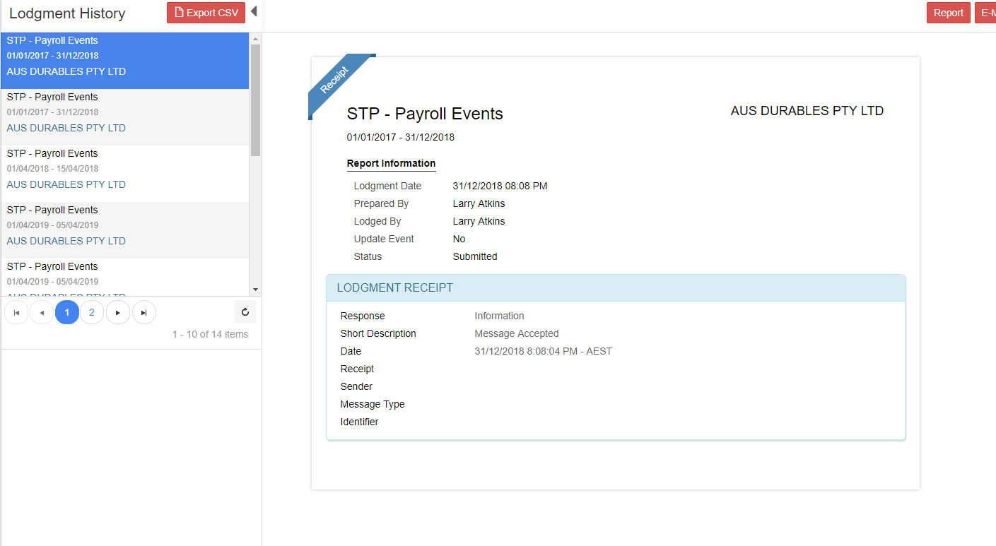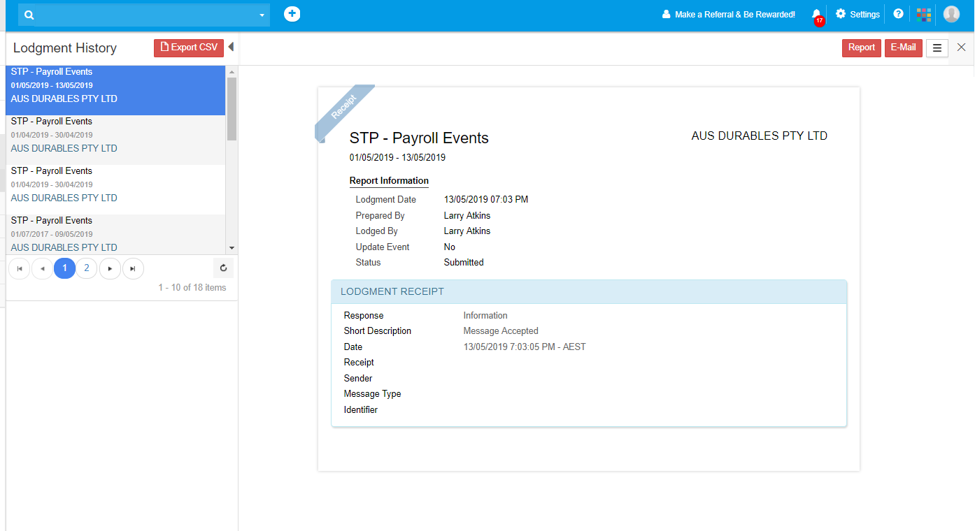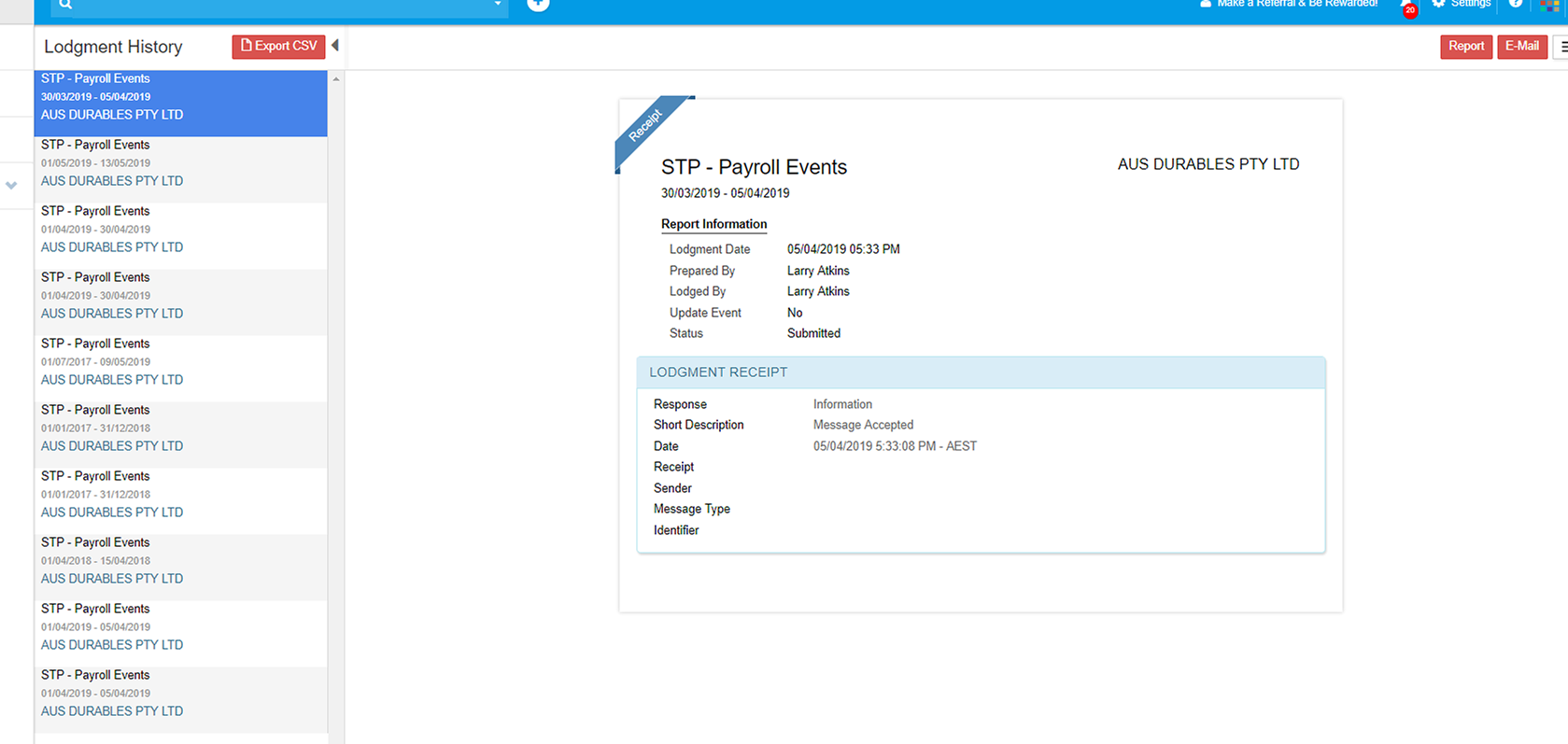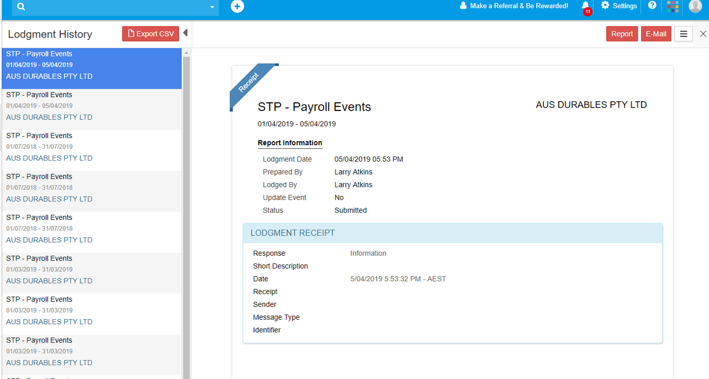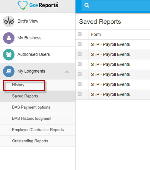 Once the report has been successfully submitted to the ATO, the report will display under My Lodgments > History.