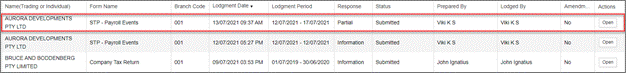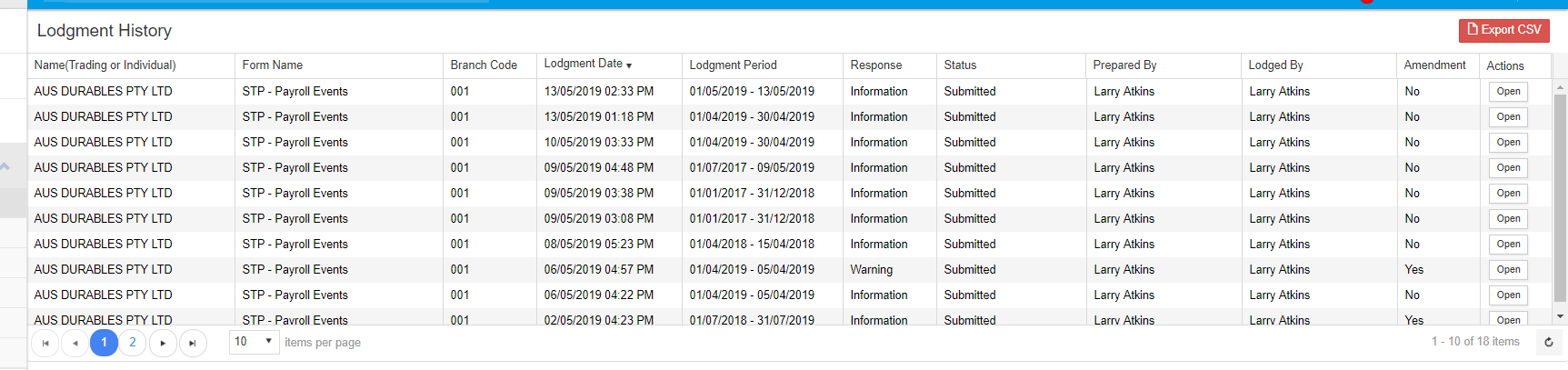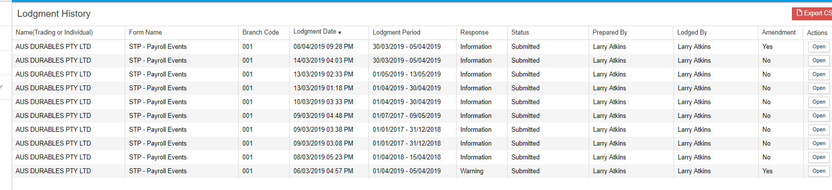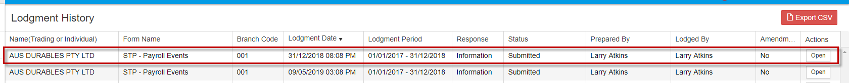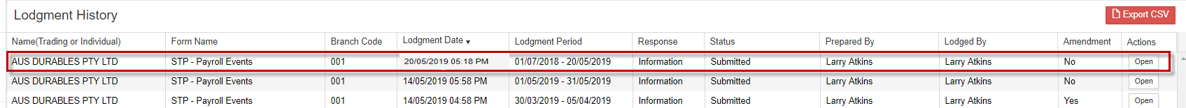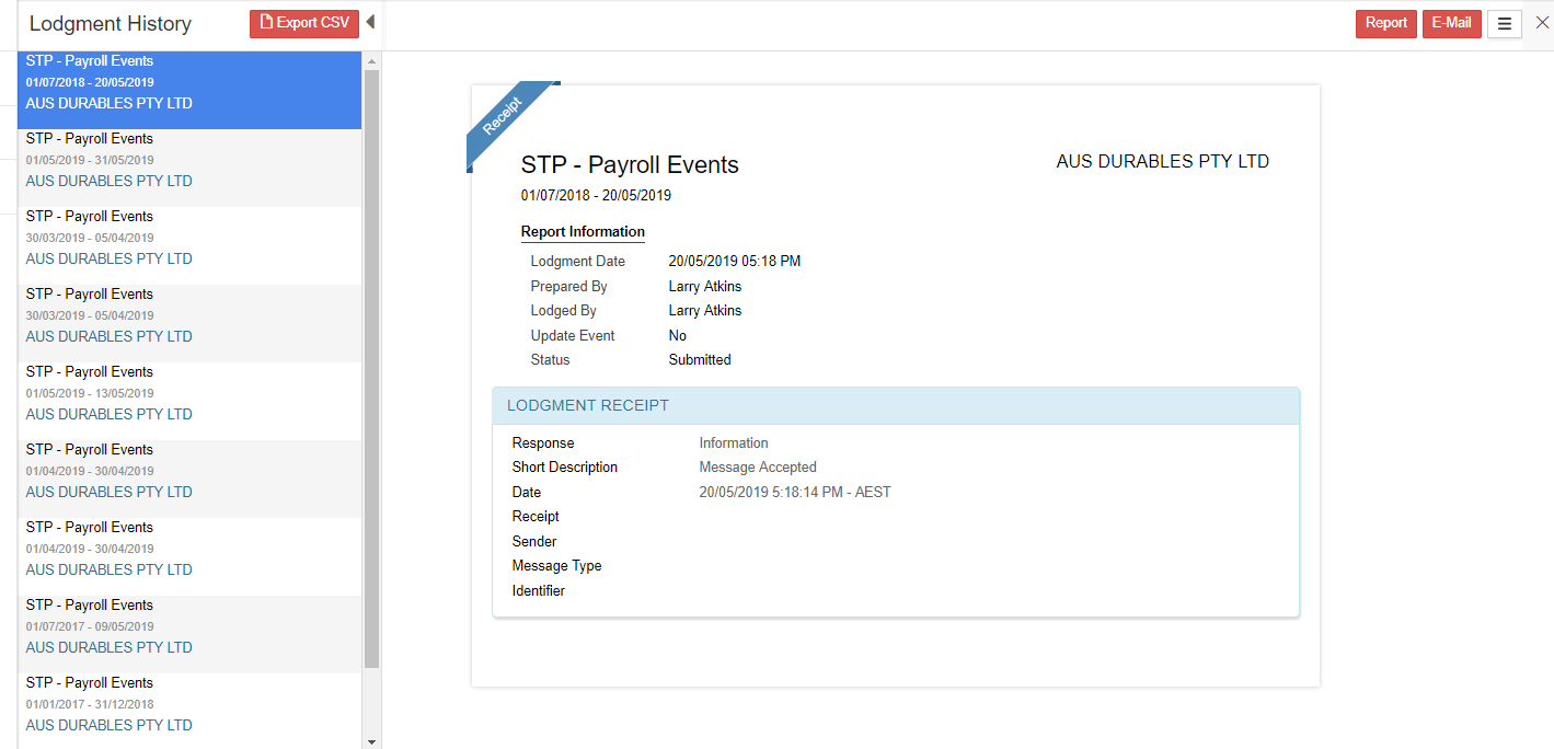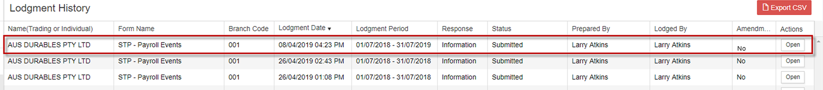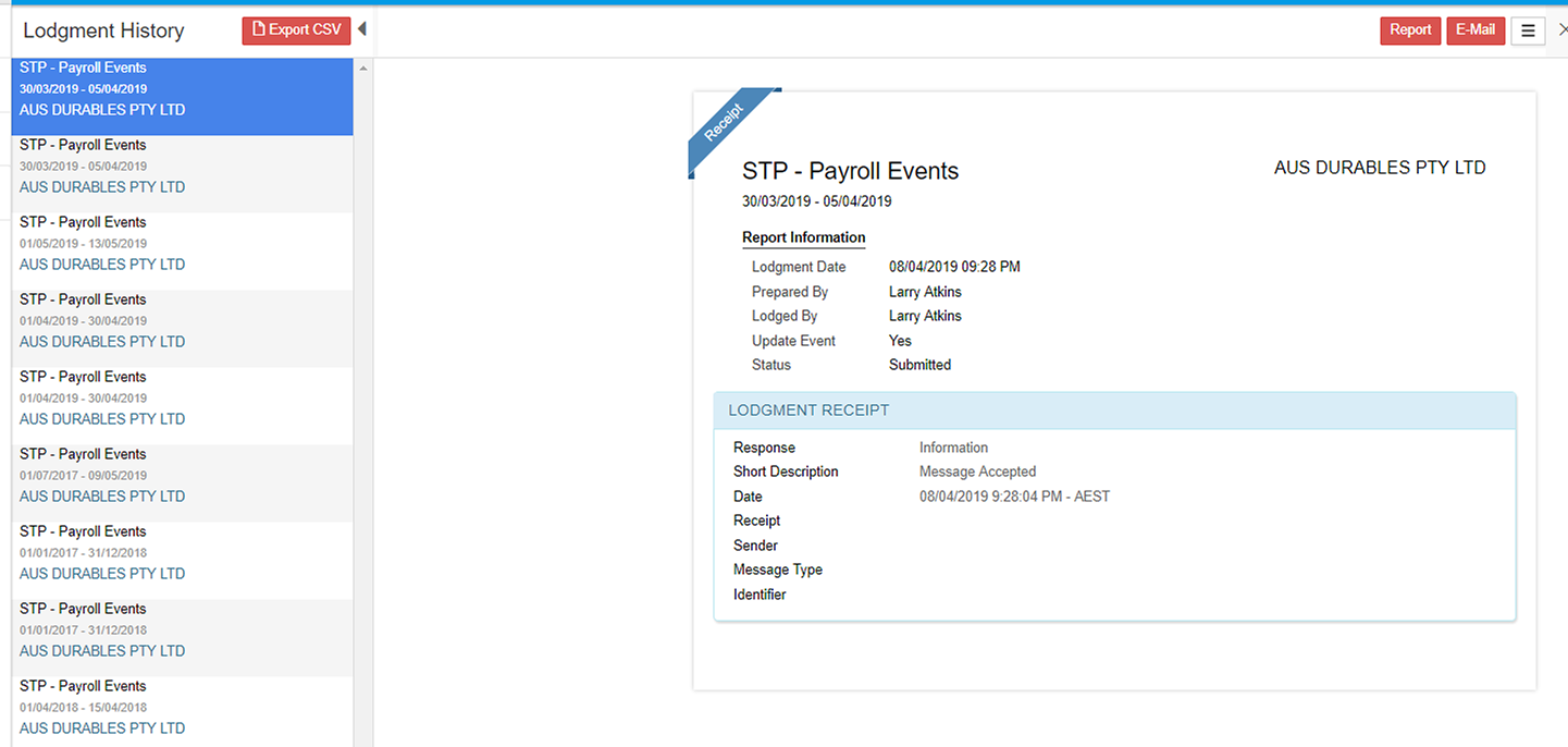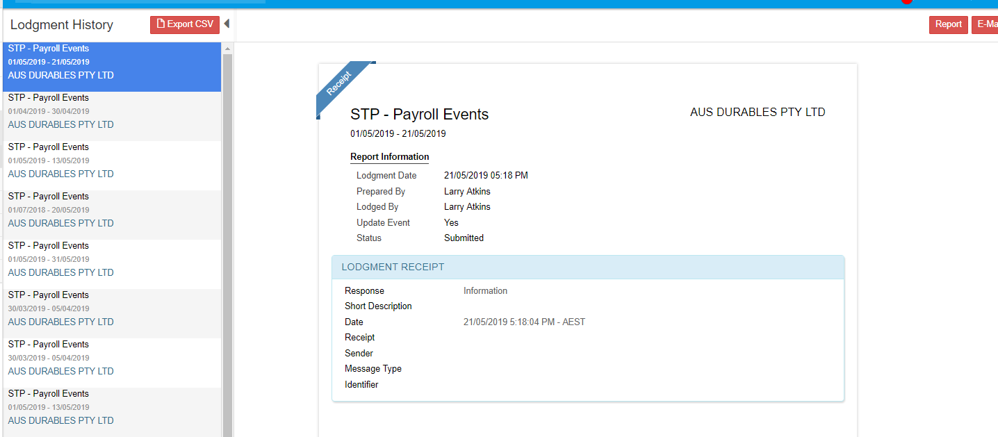Once the report has been successfully submitted to the ATO, the report will display under My Lodgments > History.