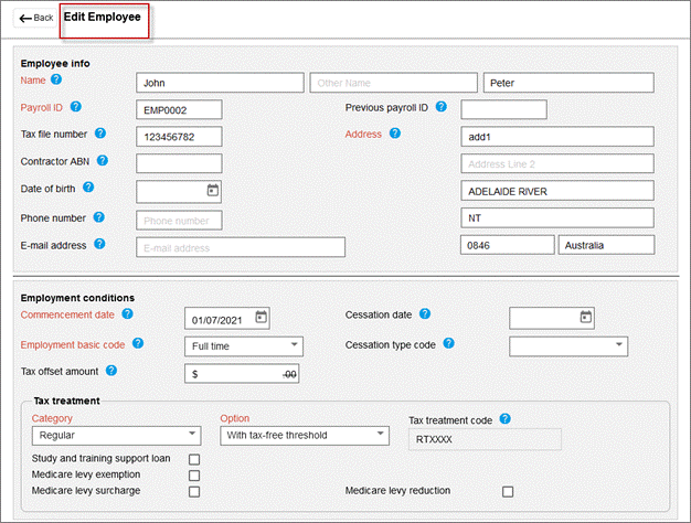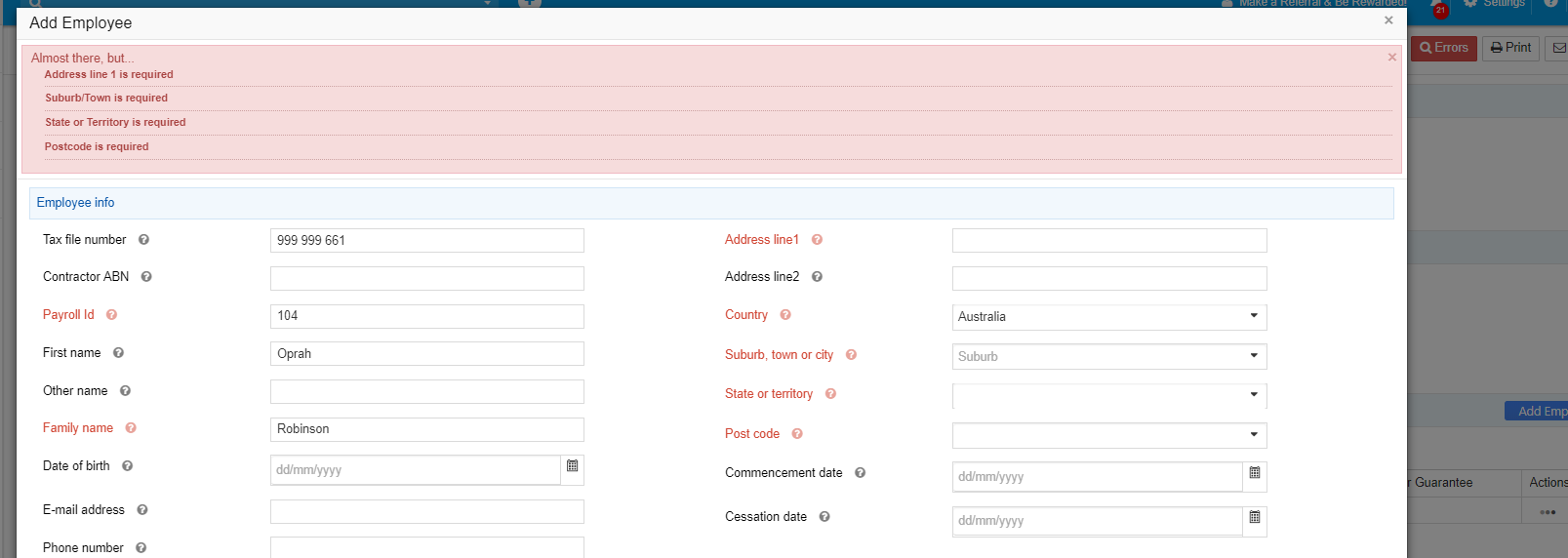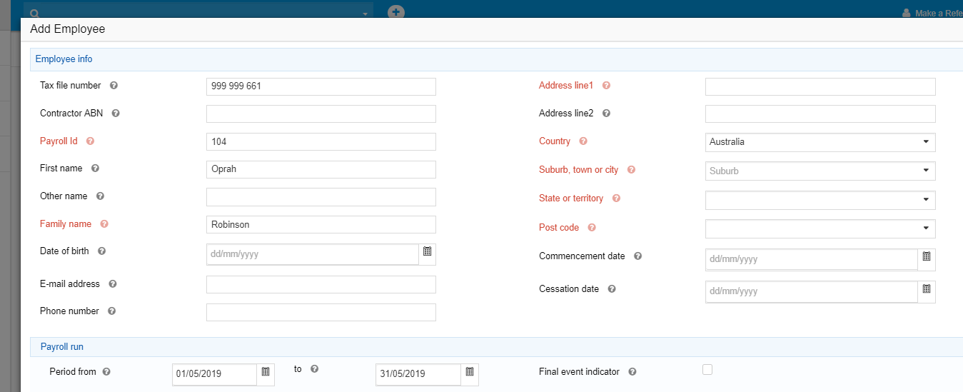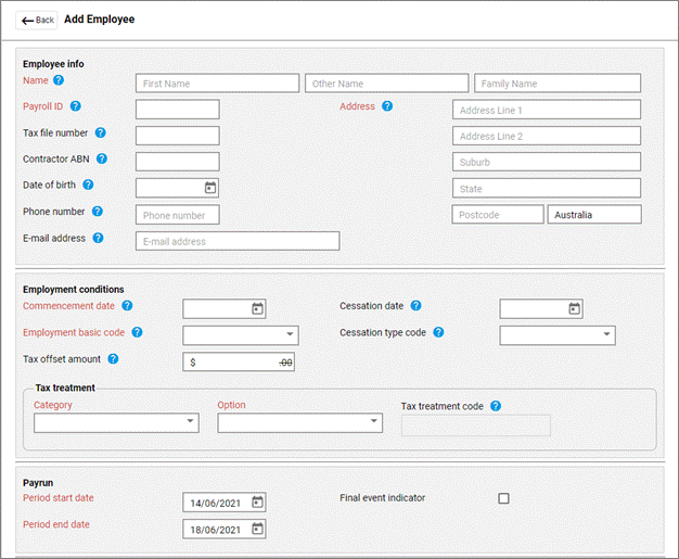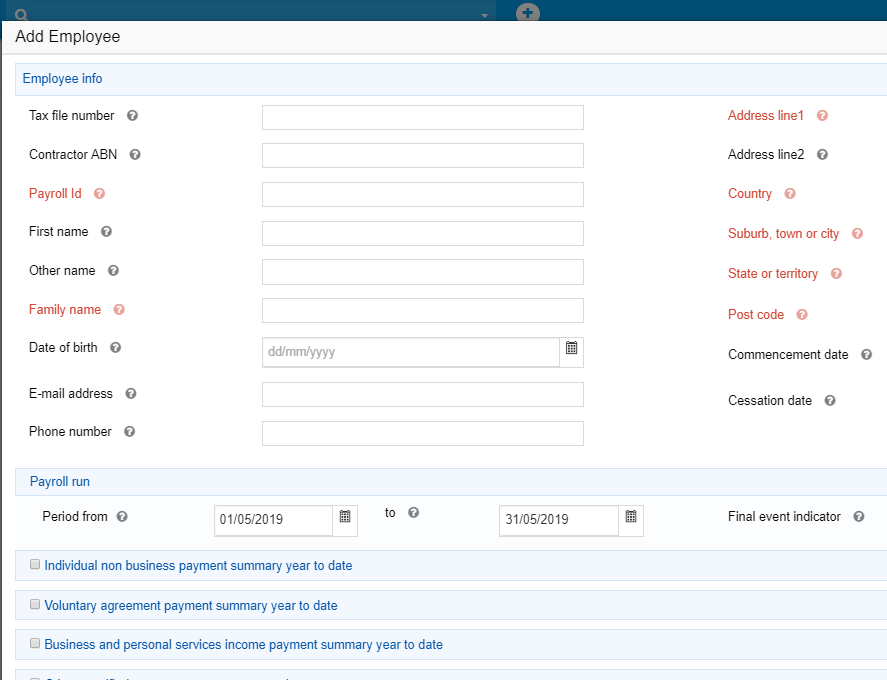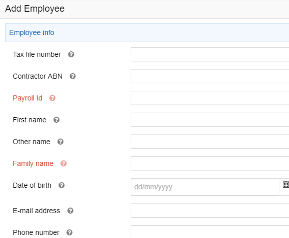 Enter all required employee information. Fields in red are compulsory to fill in.