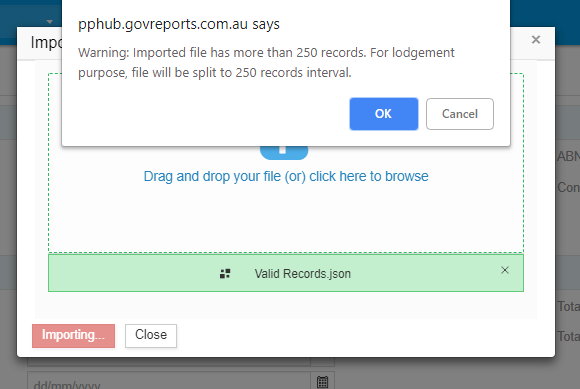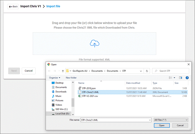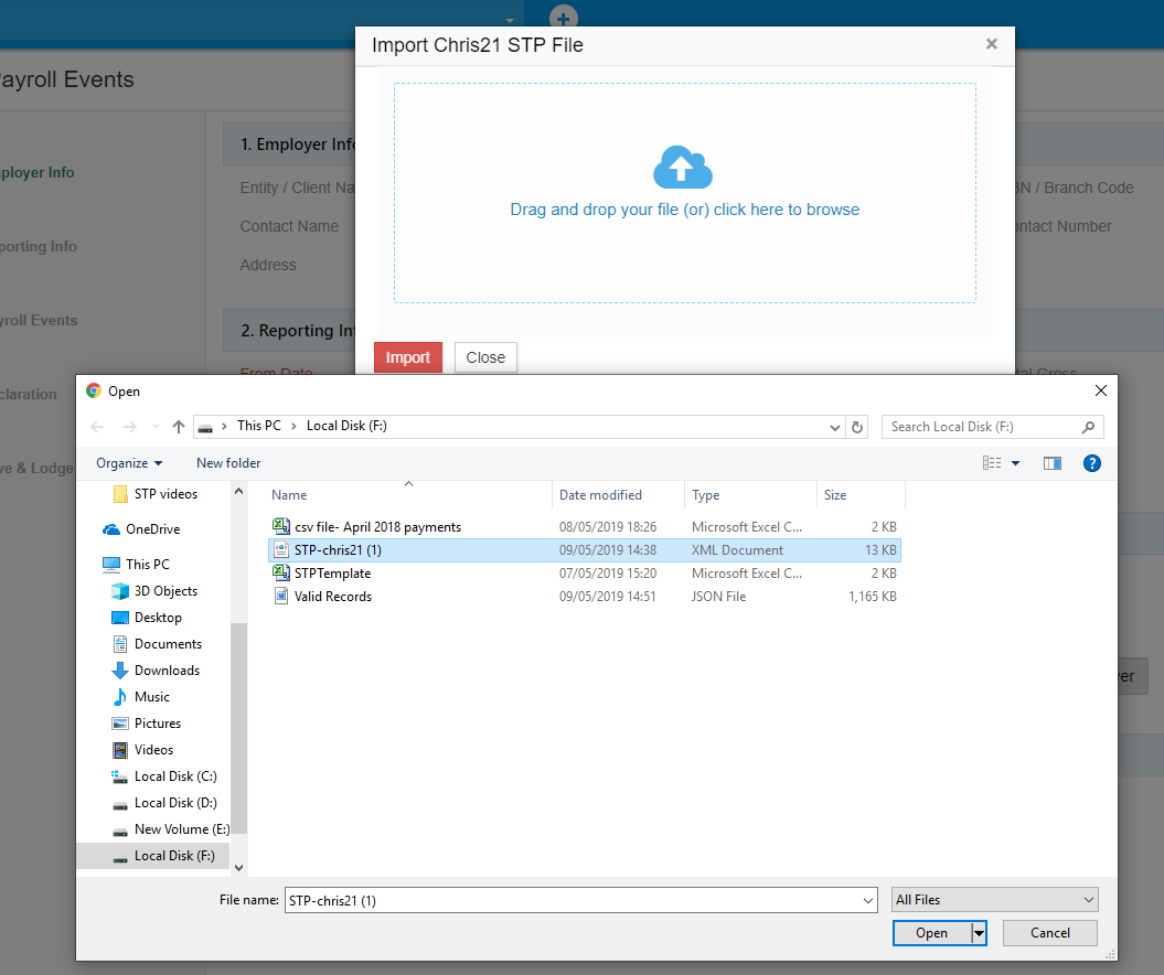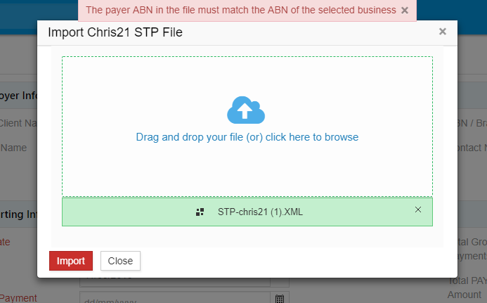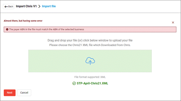 If you get this message, the selected Chris21 STP file cannot be imported but a different file with matching ABN can be imported.