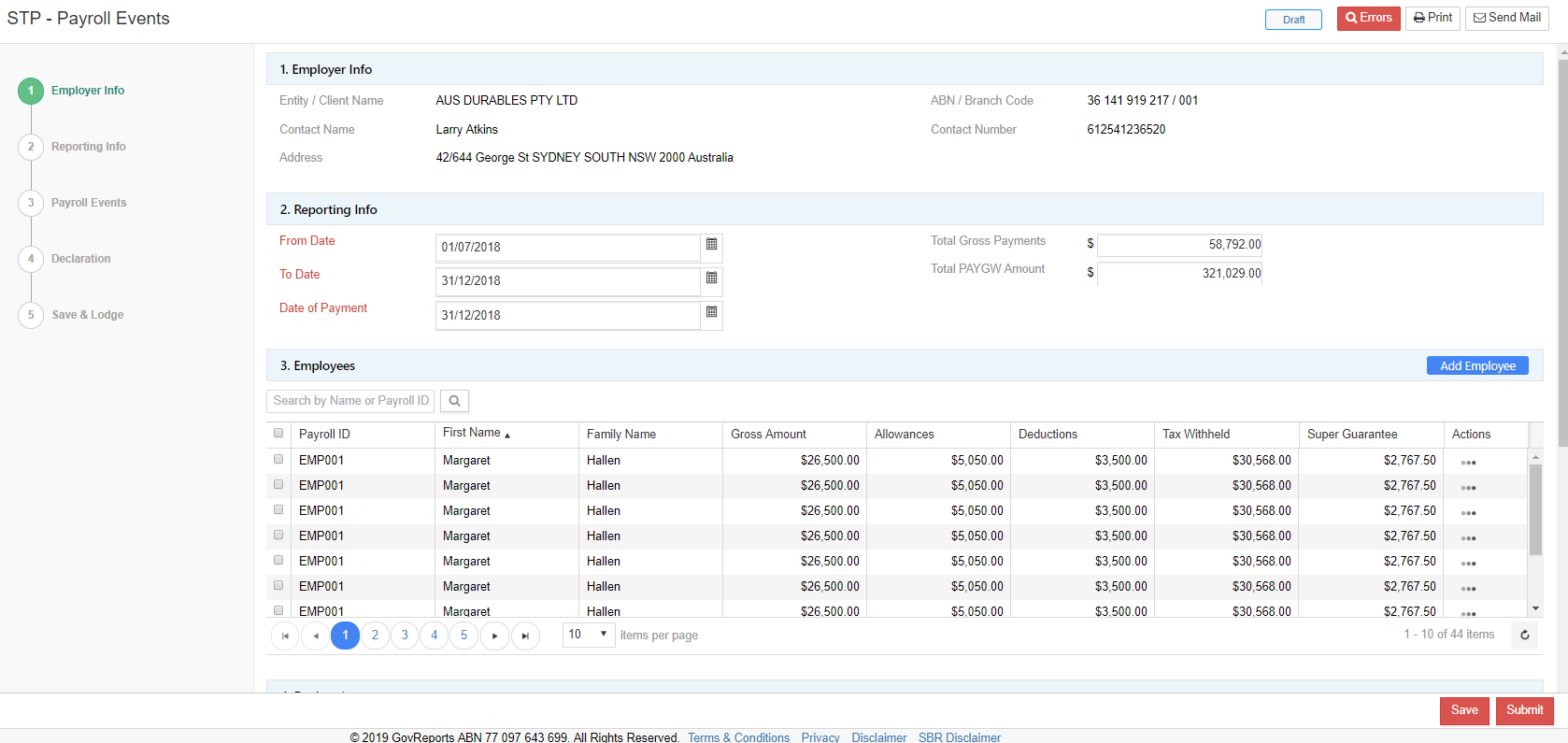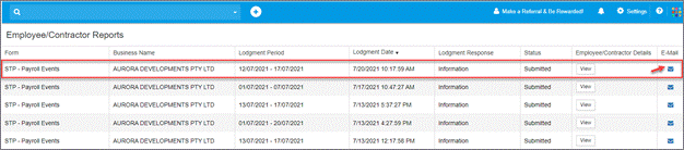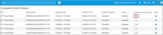 Employee details within all lodged STP reports can be viewed under My Lodgments > Employee/Contractor Reports.
