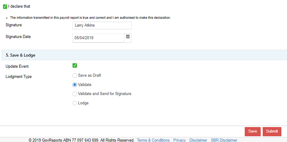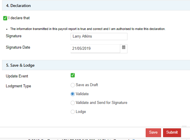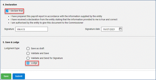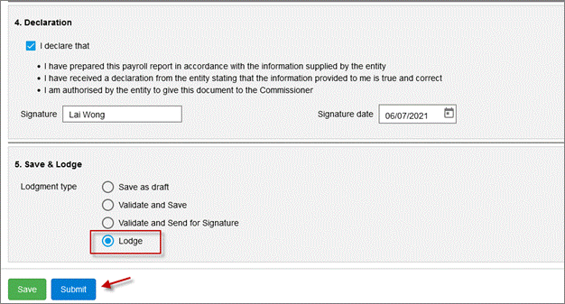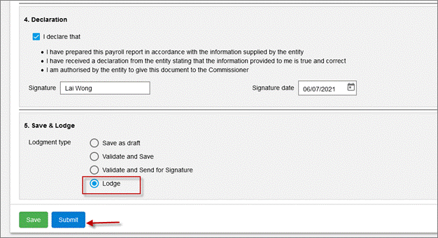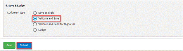 Review and make required changes, then select lodgment type. If you select Lodge and there are errors in the report, it will not lodge. You will need to fix the errors and then lodge again. If there are no errors, the report will lodge directly.