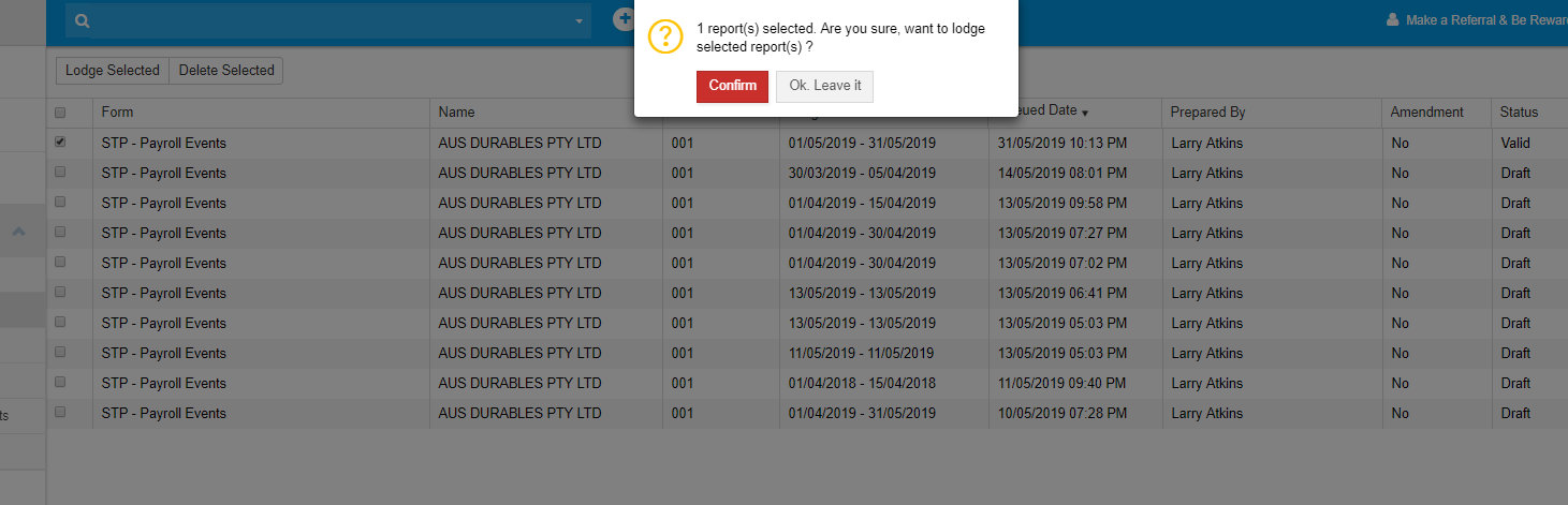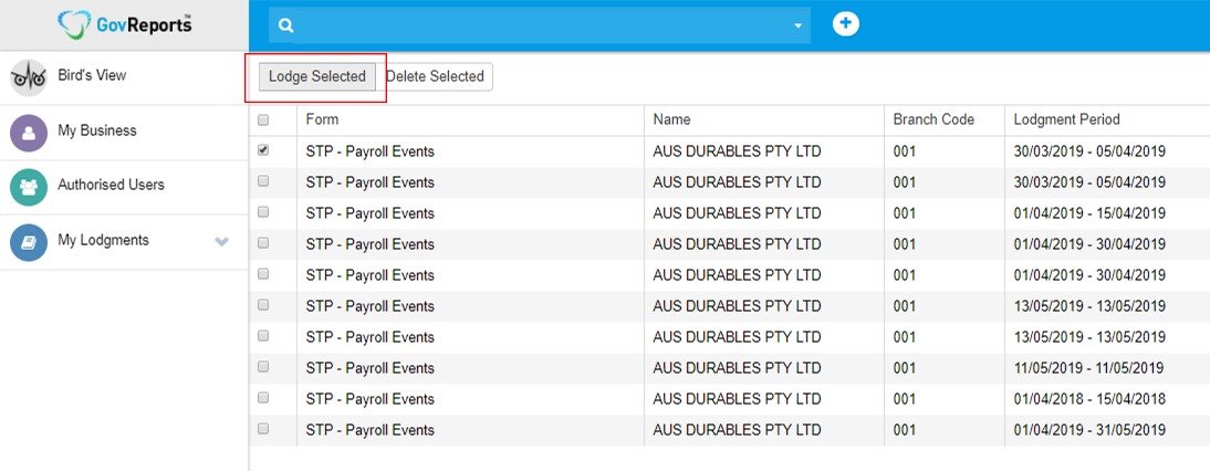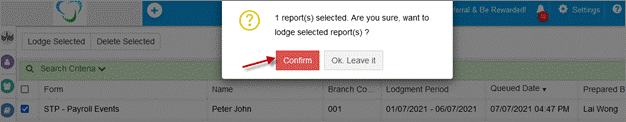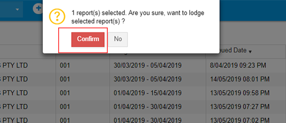 Valid status reports can be lodged directly. Go to My Lodgments > Saved Reports. Tick the required valid status report, then select Lodge Selected and Confirm.