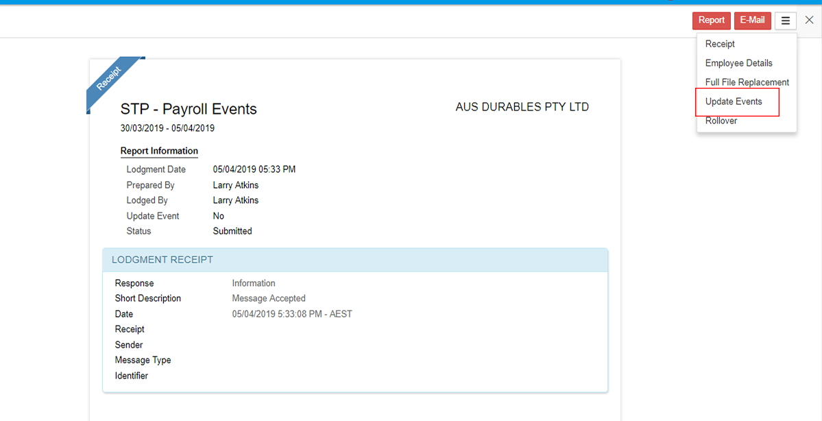 An updated event is a revision to a previously submitted event and is only done throughout the financial year to correct the amounts reported to the ATO.