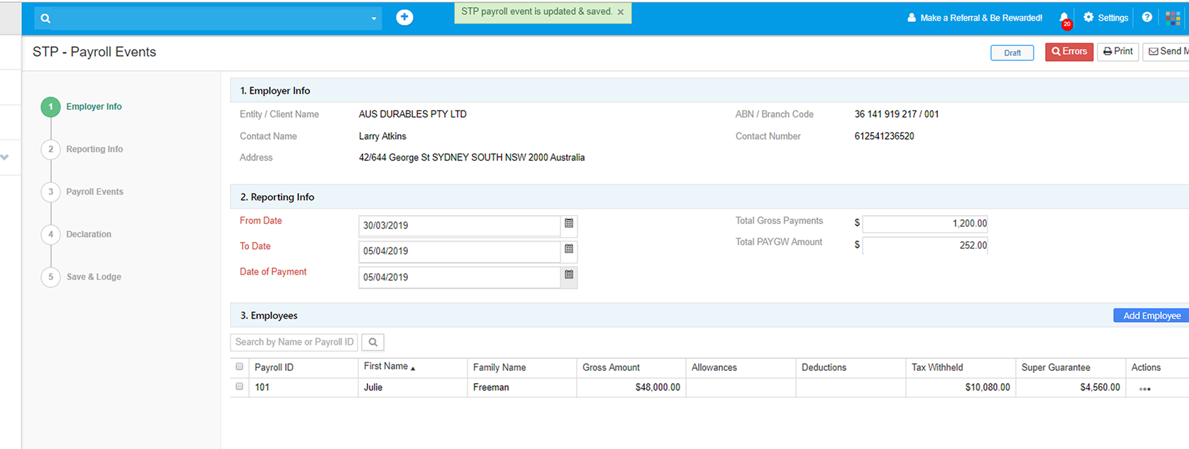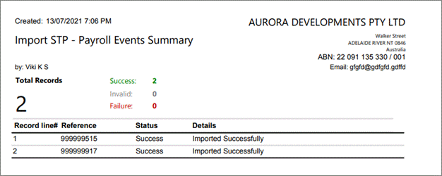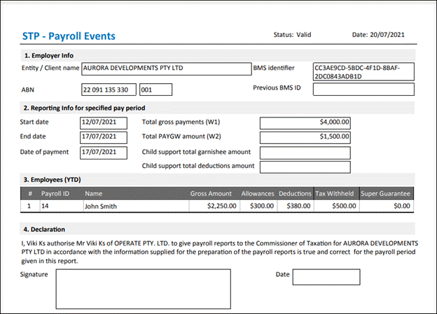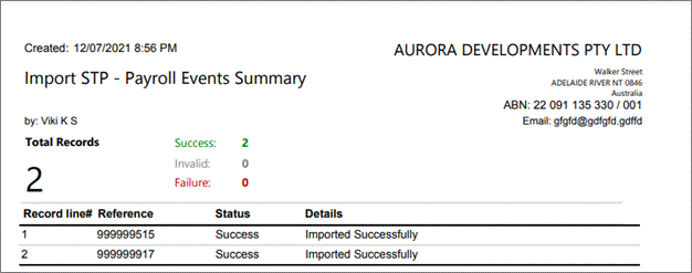 The payroll event report will open in PDF format, showing a summary of the payroll information submitted to the ATO. Save the report as desired