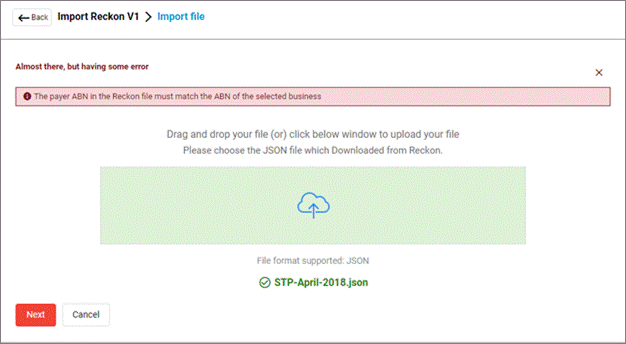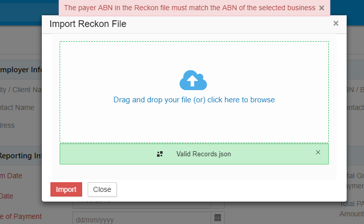 If you receive the error message “The payer ABN in the Reckon file must match the ABN of the selected business” you will be prevented from importing the file.
