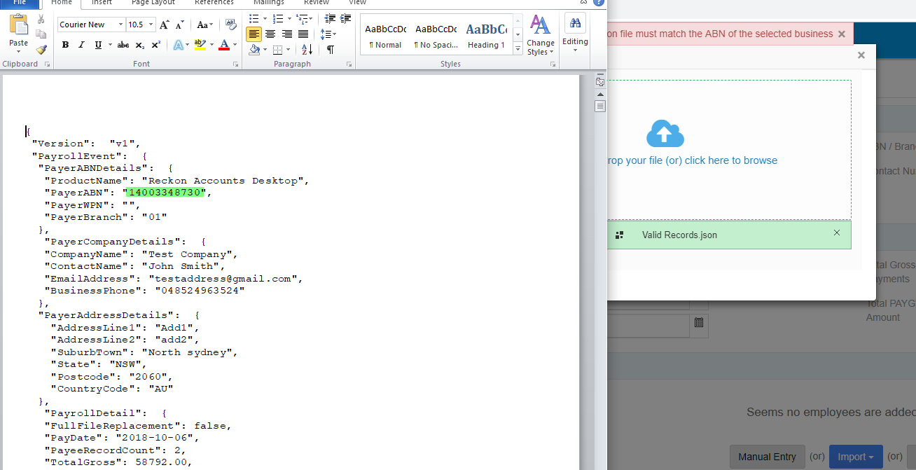 If the ABN is correct in GovReports and incorrect in Reckon, the details must be updated in Reckon, the JSON file exported again, and then uploaded again to GovReports.