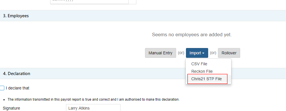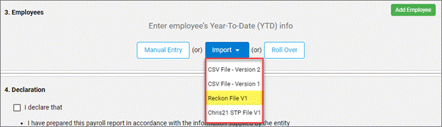 Complete the final pay run by manual data entry , importing a file from CSV, Reckon , Chris 21 or MYOB Payroll Advice Report or rolling over a previous pay run .