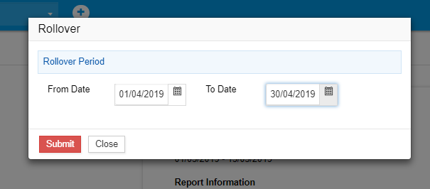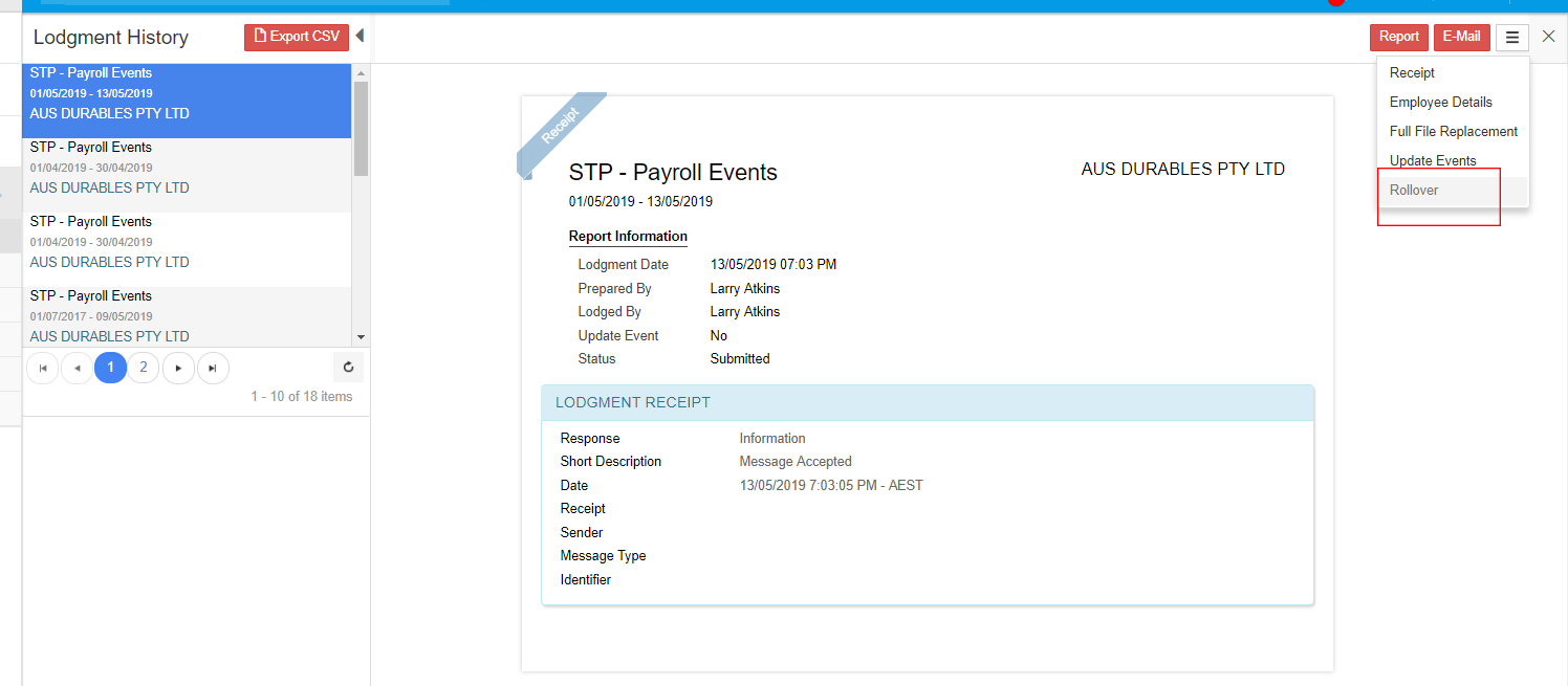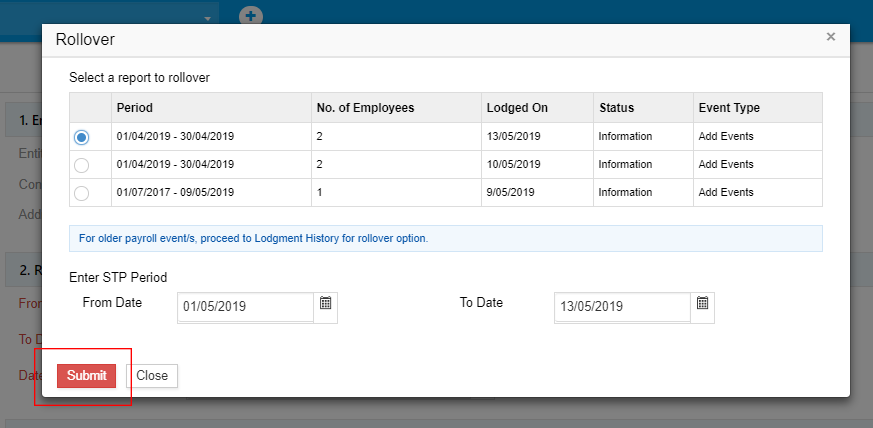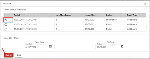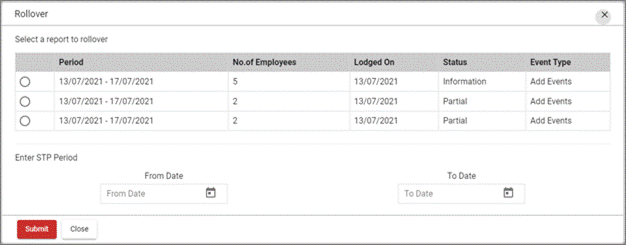 The rollover window opens. From the list of lodged reports, select the report to roll over. From each report, you can see the number of employees included in the report.