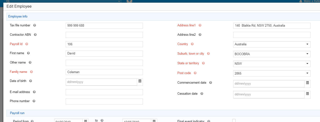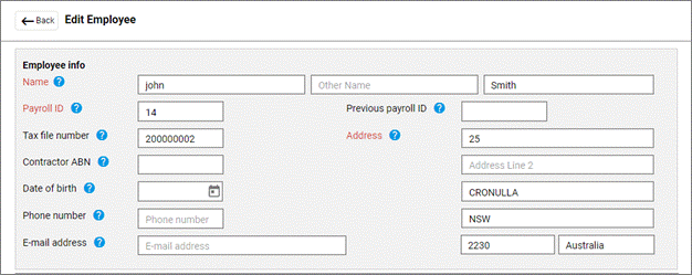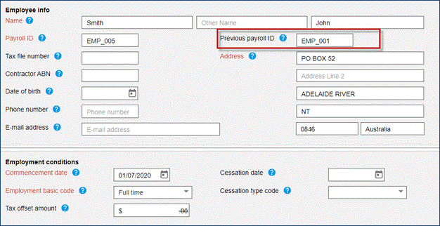 Edit the Employee info and enter the Previous payroll ID . The previous payroll ID is used to transfer payee YTD values from an old payroll ID to the new payroll ID for the payee. This is required for ATO matching of employee data already submitted via other software.