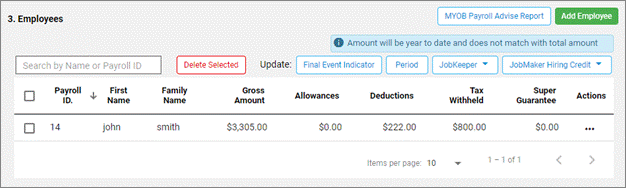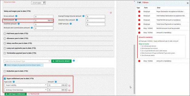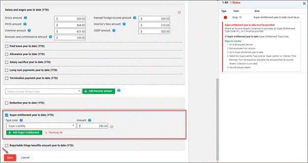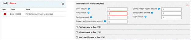 If you receive the error message “Amount will be year to date and does not match with total amount”, check that you have entered the year to date figures, not just the specified pay period figures.