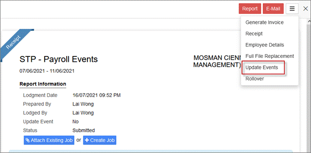Open the lodged STP report and select the overflow menu icon. Select Update Events and then select Yes to confirm the update.
