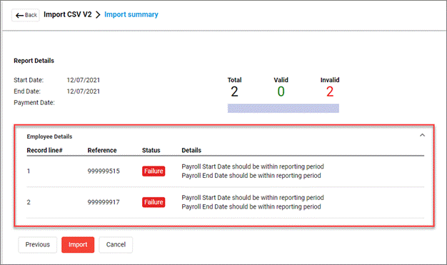 Correct the entries in Reporting info for specified pay period and import the MYOB Payroll Advice Report again.