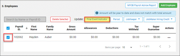 You can mark a pay run as a final event for an employee any time during the financial year. For example, for employees who have ceased employment in the middle of the financial year, you can submit the final event indicator upon their termination.