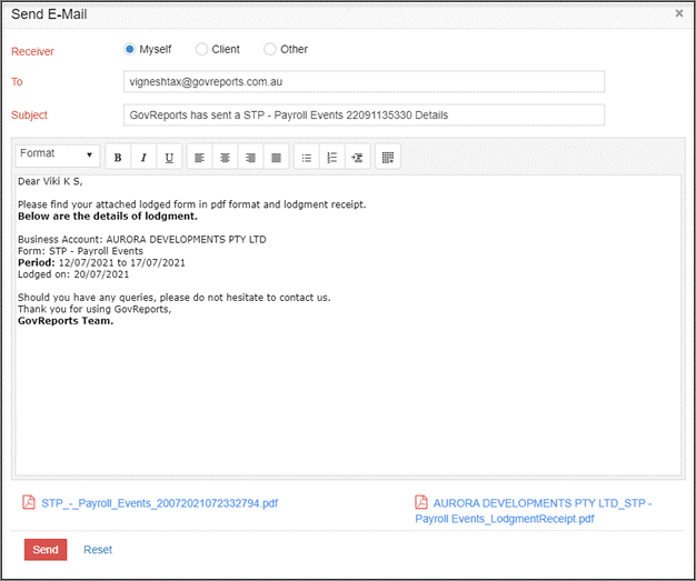 Check the email address and name of the client are correct, customise the message if required, then Send. Both the payroll event report and the lodgment receipt are automatically attached to the email.