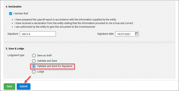 In the Save & Lodge section of a payroll event, select Validate and Send for Signature, then Submit.