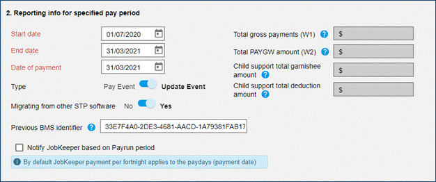 Select Yes for Migrating From other STP software . Enter Previous BMS Identifier. You will need to retrieve this from the software previously used to lodge STP or from the ATO online services STP reporting history.