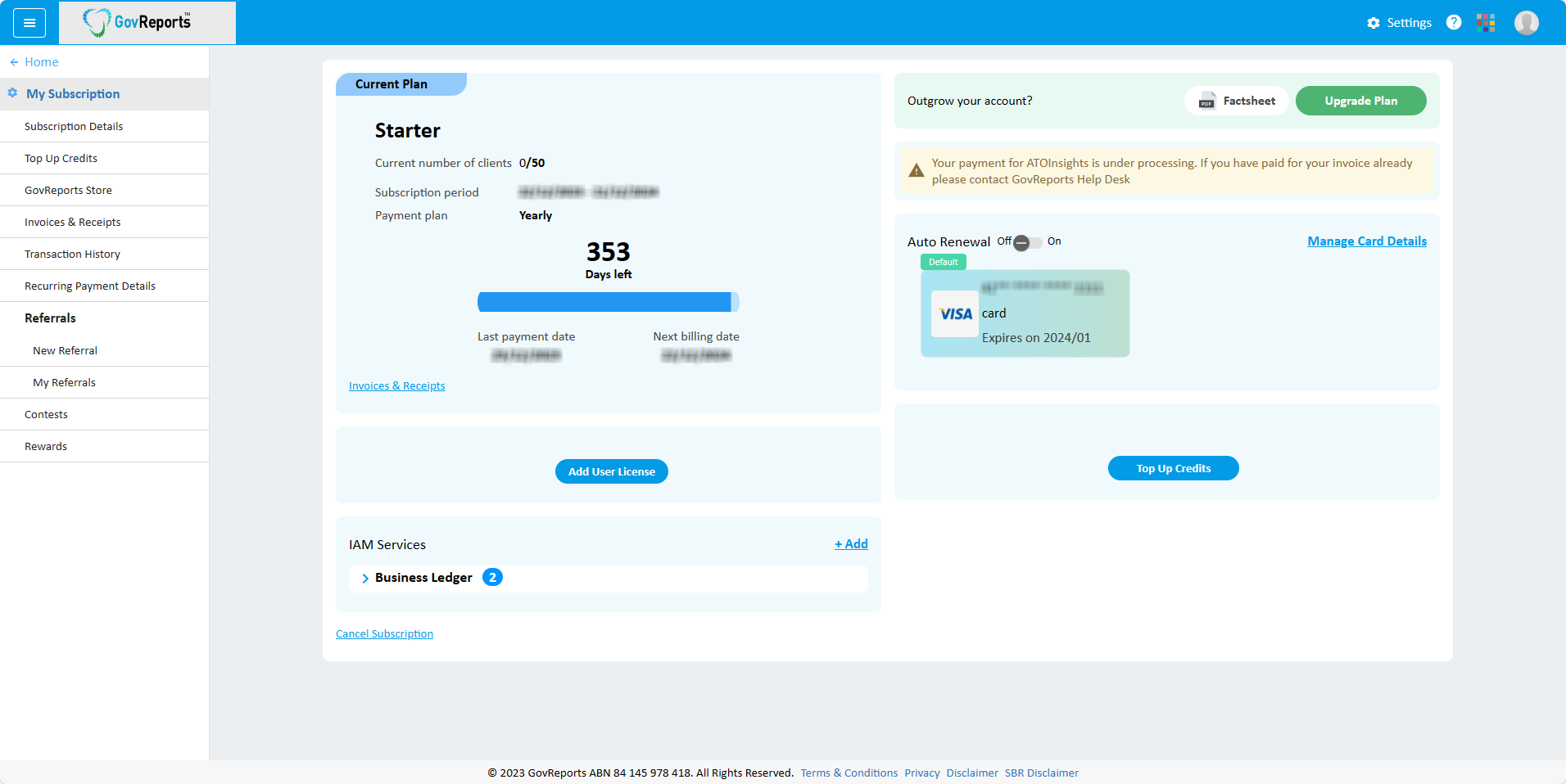 Enables the management of your relationship with GovReports including your credit balances for Pay-Per Lodgment and or subscriptions access as well as purchases of GovReports services, Pay-Per-Lodgment transactions, access to list of all services purchased or not yet purchased to add to your account, billing details and past payments and so forth.