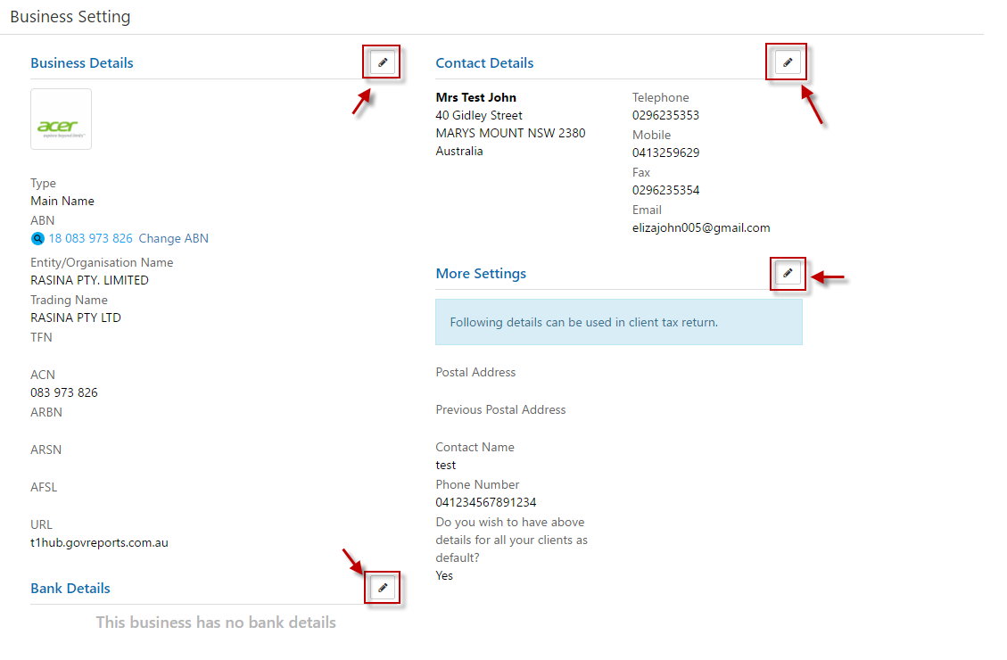 To edit details on Business Setting, Click Edit and go direct to the field that you want to change and type over