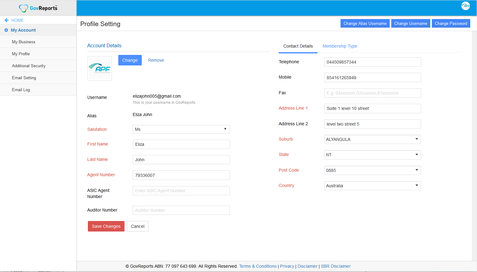Setting up your profile enables GovReports to identify you on support request and within the system. Your unique email address is set up as your unique GovReports username and billing related matters including reminders and notifications, account and password resets. You can upload your picture or logo for personal identity and professional look to your account. Telephone number and contact details are optional and for us to contact you when in need or return your support enquiries.